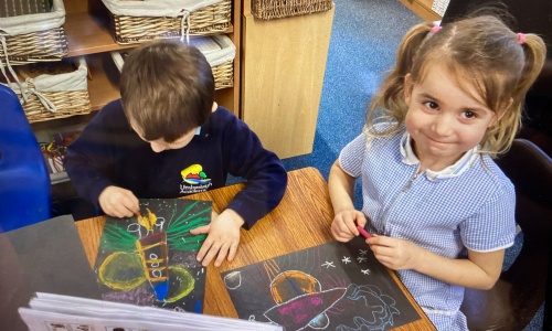 This week, Squirrel class have been exploring the bold, colourful artwork of Peter Thorpe, an artist known for his striking space‑themed paintings.
